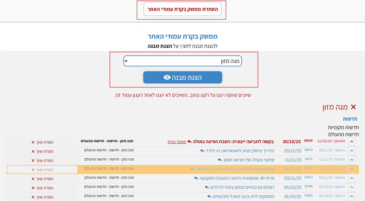 חשוב: הסרת שיוך מעמוד הבית ו/או עמודים ראשיים יגרום לחסר במספר המאמרים מוצגים בעמוד. יש להשלים את המאמרים למיקום נתון במידה ובוצעה הסרה באמצעות רשימה זו.