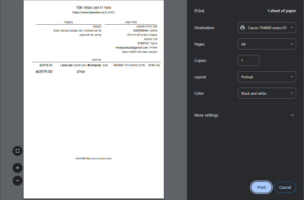 לחיצה על הלחצן מציגה את חלונית ההדפסה ולצידה מראה העמוד שיודפס.