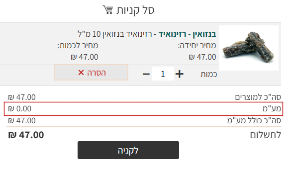 הוספת מוצר לסל תציג את סכום המע"מ כ 0.